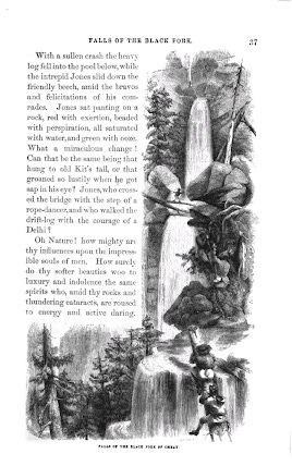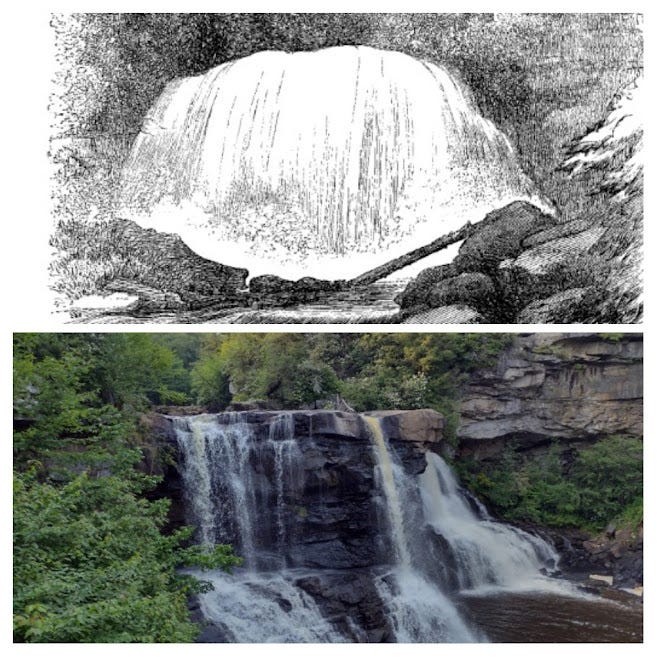 You may be wondering why I’m telling you about West Virginia waterfalls instead of sticking with my usual stoop schtick. It started with this Strother illustration included in his 1853 account of his hunting and fishing trip to Canaan Valley, the one that made quite a splash (see what I did there?) around the country, making him a household name.